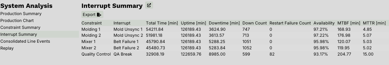 In addition to the summary, you can view the flow rates of the constraints and the levels of the buffers in graphical form for the entire experiment timeline. Line event, constraint, and interrupt reports are also available for viewing and export. For example, here is the interrupt summary for this single run. It shows that the mold unsync interrupts had the highest number of occurrences.