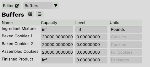 Next, we will handle the buffers. We have already taken care of the initial buffer in a previous step, so the first buffer we are concerned with is for baked cookies. Recall that these lines are producing cookies at a rate of approximately 5,000 per hour. We will set up a 4 hour buffer of 20,000 cookies on both lines.