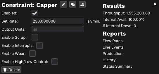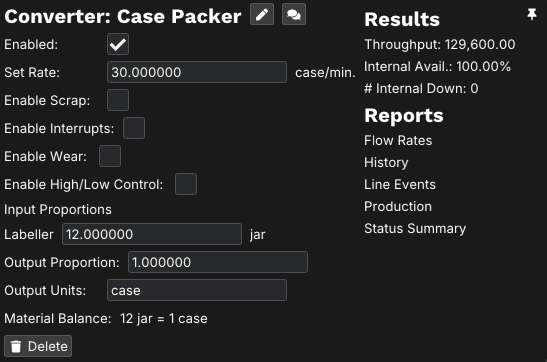 Once the jars are complete, we want to pack them into cases. for our example let's assume they're being packed into cases of 12 jars, and that the case packer can create about 30 cases per minute. Withe these parameters, this node would look like the following.