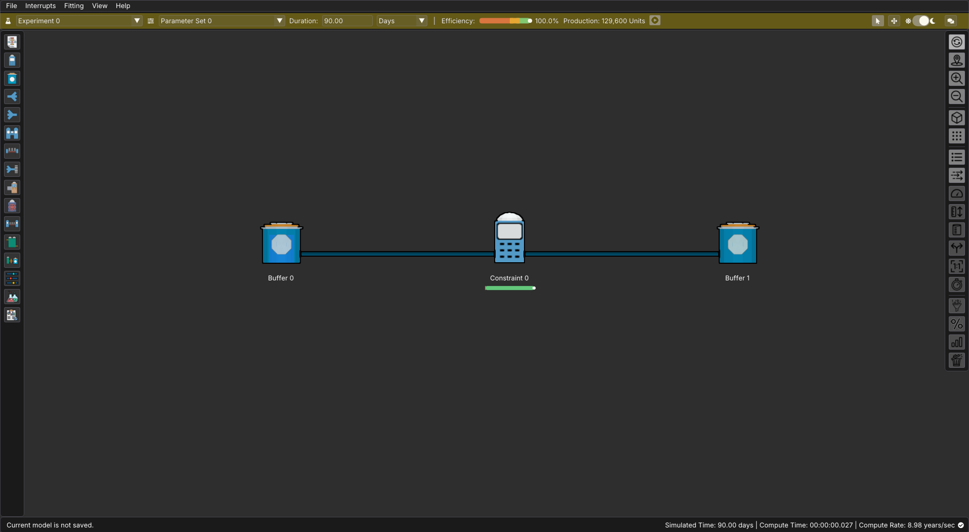 The most important indicators on the top bar are the Efficiency Gauge and Production Throughput, located to the right of the run duration controls. After running a simulation, these display the overall efficiency percentage and total production quantity for your model.